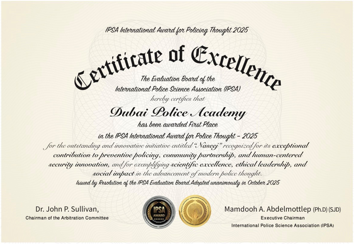 The International Police Science Association (IPSA) is proud to announce that the Dubai Police Academy has been awarded First Place in the IPSA International Award for Police Thought – 2025, within the category of Innovative Police Thought and Preventive Security.